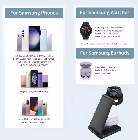 Carregador 3 em 1 sem fio para Samsung – smartphone, smartwatch e earbuds